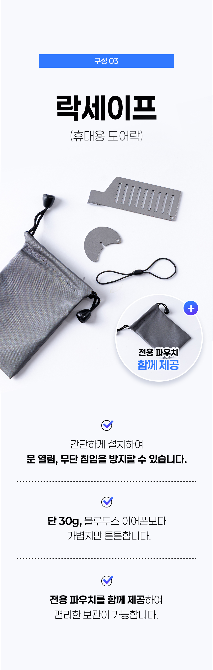 ±¸¼º µµ³­¹æÁö°¡¹æ(S), RFIDÂ÷´Ü ÆÄ¿ìÄ¡, ÈÞ´ëÆù½ºÆ®·¦, ÈÞ´ë¿ë µµ¾î¶ô Á¦Ç°±Ô°Ý S »çÀÌÁî °¡¹æ : 215 x 140 x 60mm,RFIDÂ÷´Ü ¿©±ÇÆÄ¿ìÄ¡ : 210 x 130 x 30mm, ÈÞ´ë¿ëµµ¾î¶ô 80 x 30 x 1.5 mm, ÈÞ´ëÆù½ºÆ®·¦ : ´Ü¸é±æÀÌ 750mm / ÃÑ ±æÀÌ 1,500mm