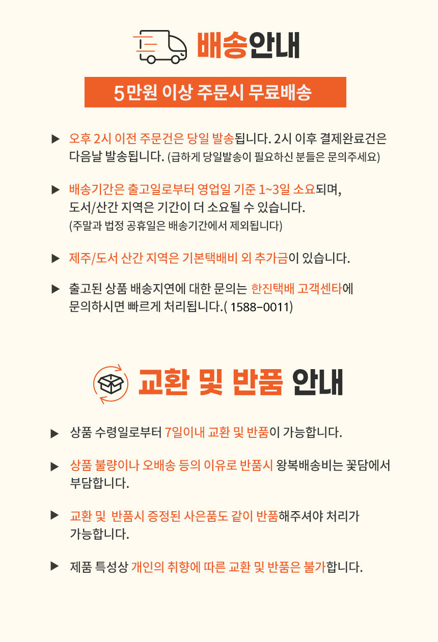 - ÁÖ¹®µÈ »óǰÀº Á¦Ç°°ú ¼ö·®¿¡ µû¶ó ´Ù¼Ò Â÷À̰¡ ÀÖÀ¸³ª, º¸Åë ¹ßÁÖ ÀϷκÎÅÍ 3~7ÀÏ À̳» ¹è¼ÛÀ» ¿øÄ¢À¸·Î ÇÕ´Ï´Ù. (µµ¼»ê°£Áö¿ªÀÇ °æ¿ì¿¡´Â 1~2ÀÏÀÌ Ãß°¡·Î ¼Ò¿äµÉ ¼ö ÀÖ½À´Ï´Ù.)